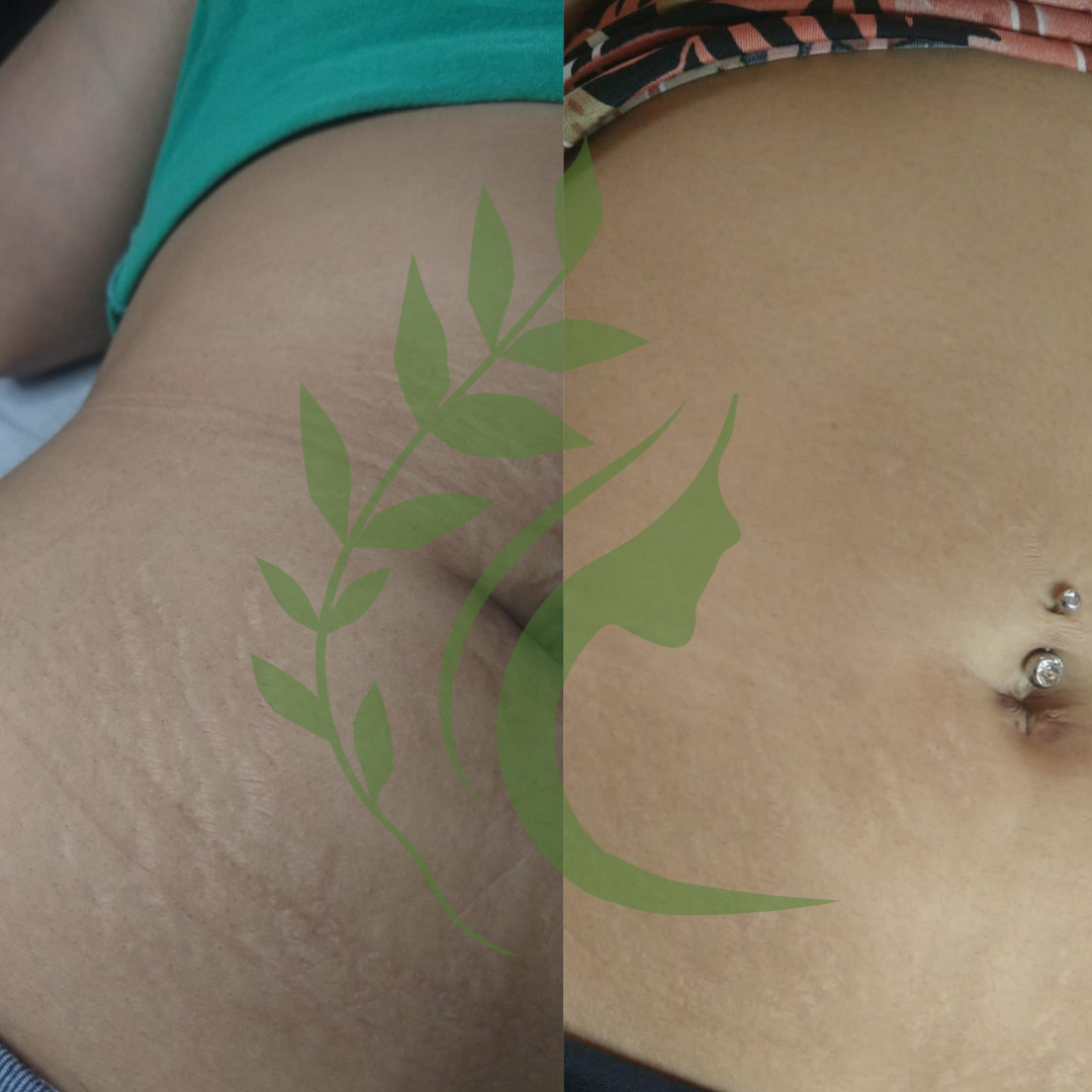 Las estrías siguen ahí (seamos realistas), pero ya no son lo primero que ves. El tono se unifica, las marcas se difuminan, tu piel se ve más pareja y cuidada.